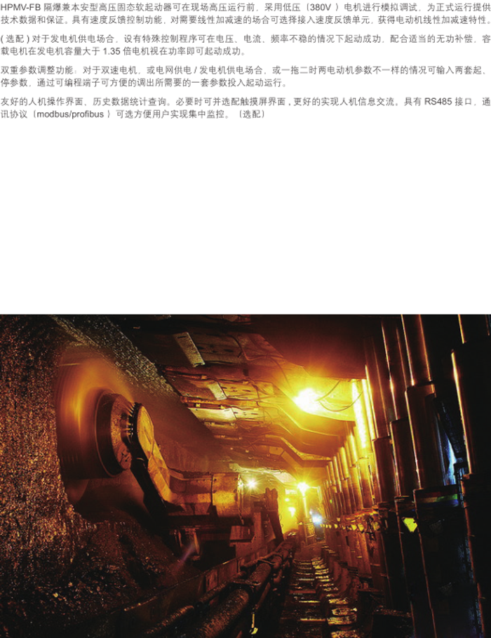 HPMV-FB系列礦用隔爆兼本質(zhì)安全型高壓交流軟起動器具有多種起動方式、控制功能和完善的電機(jī)綜合保護(hù)功能。消除了機(jī)械及電流沖擊,延長了設(shè)備使用壽命,提高礦用設(shè)備的穩(wěn)定性、安全性。主要適用于煤礦礦井下和其他周圍介質(zhì)中含有甲烷及煤塵混合物的爆炸性氣體及條件惡劣的特殊環(huán)境中。